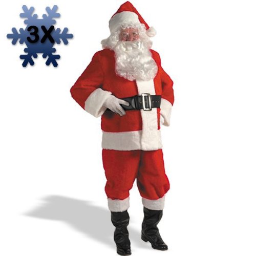 This popular style santa suit is deluxe pile plush with deluxe white pile plush trim. Available in Adult Men's size 3X, 64-70 Jacket (up to a 63" waist). Suit includes: Zipper coat with belt loops, Pants, Hat with large white pom-pom, Bound belt with loop and gilt buckle with prong, Deluxe vinyl boot tops with deluxe white pile plush cuffs, White knit gloves. Wig, beard, and glasses not included.and Buy Over $25 Get Free Shipping Super Saver For You Only !